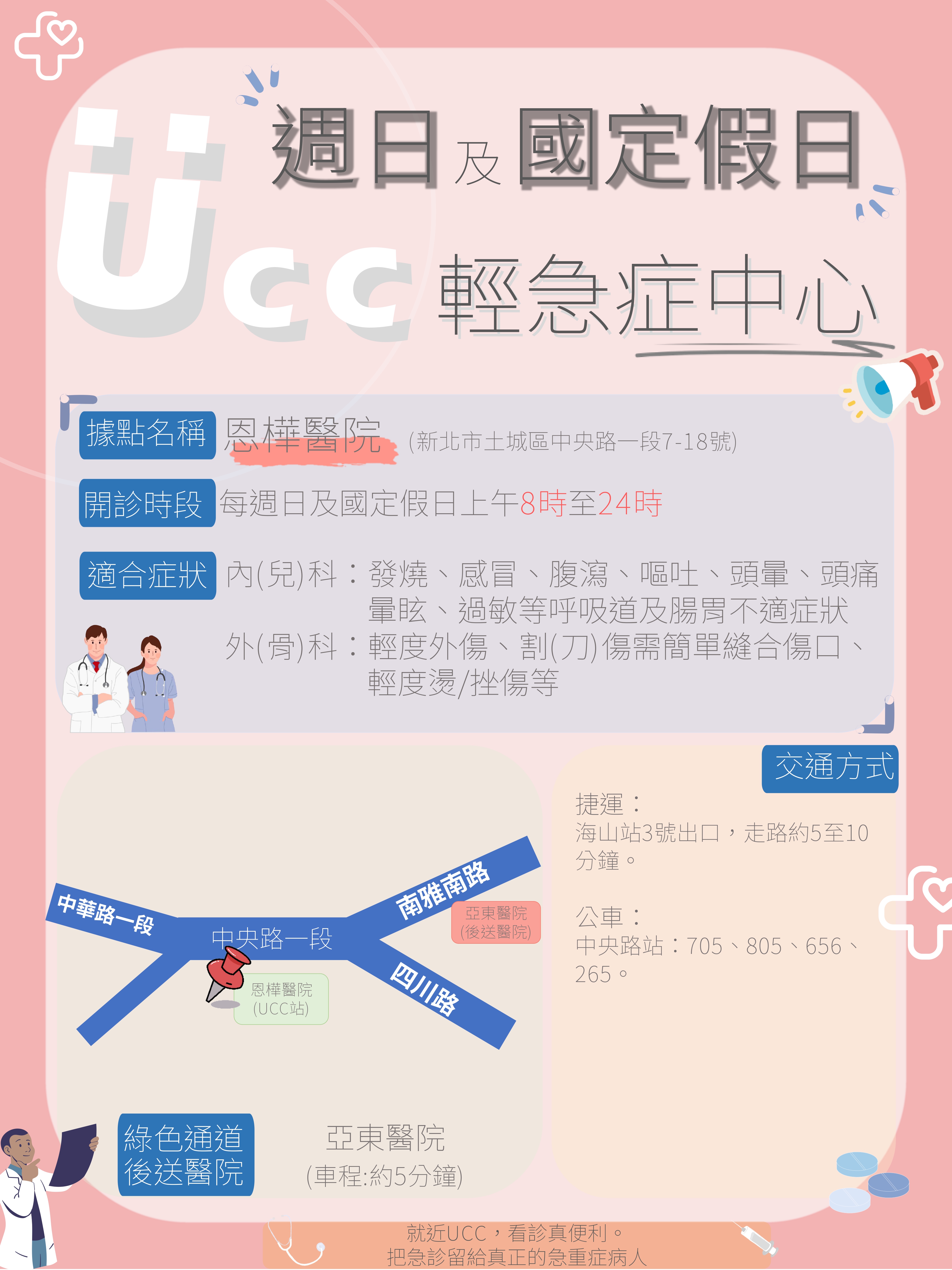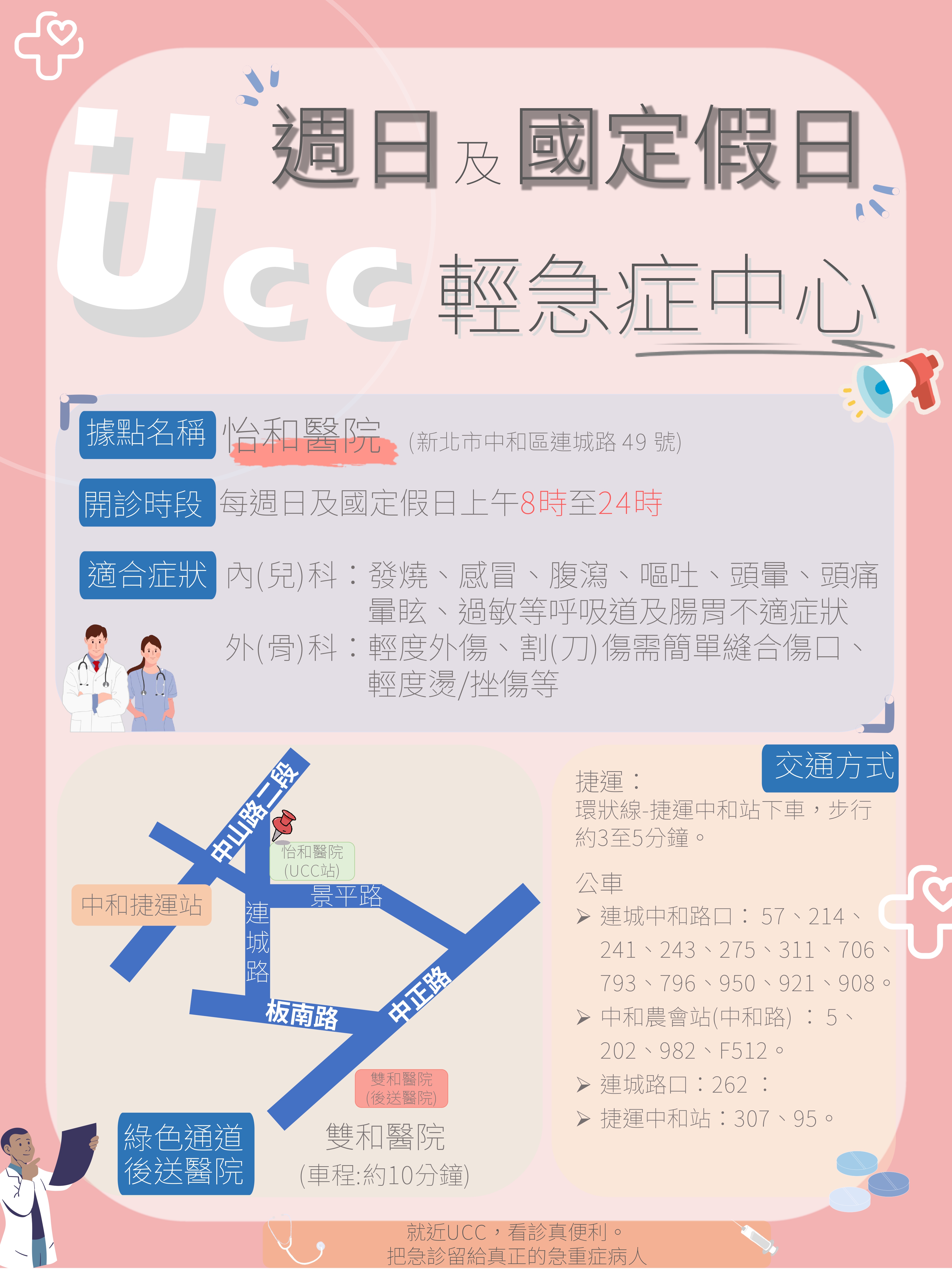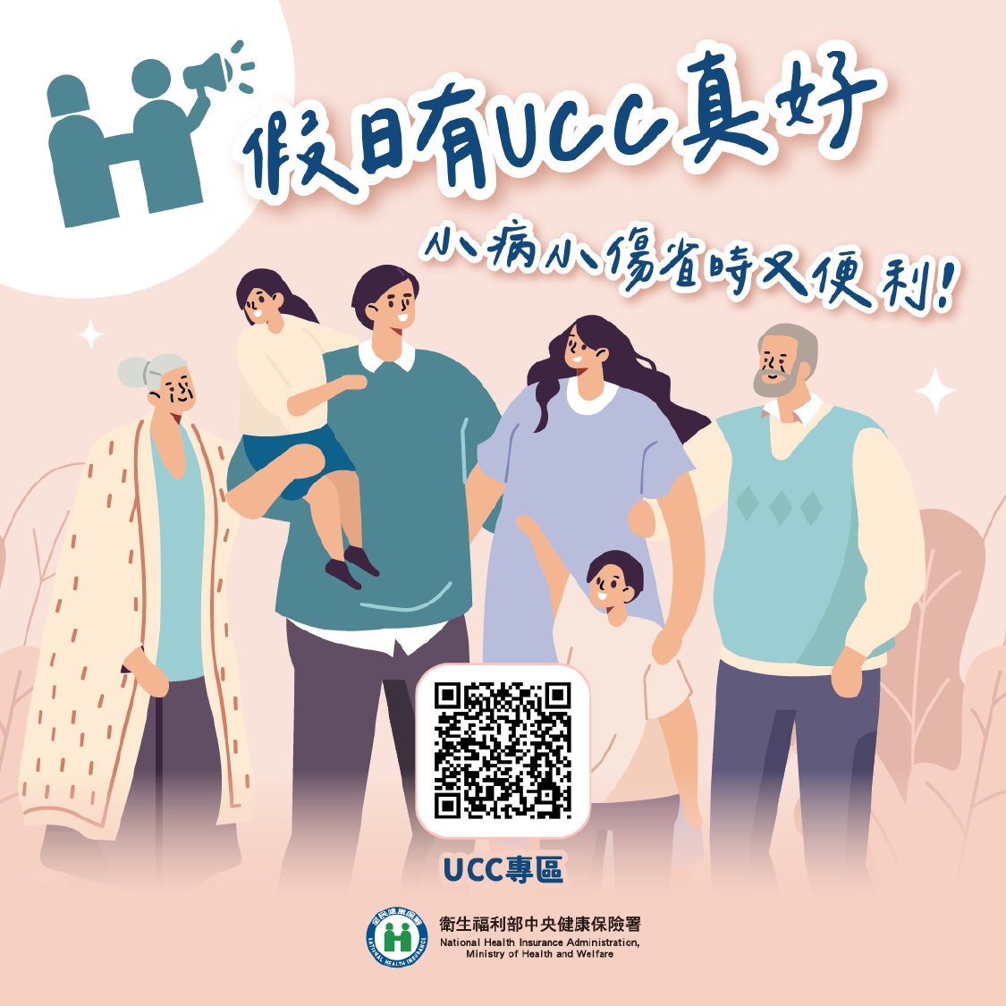 (一) 輕急症中心UCC於114年11月正式實施。 (二) 假日輕急症就診分流更省時便利。 (三) 週日及國定假日8點~24點,發燒、呼吸道或腸胃道症狀、簡單傷口、小兒急性不適等就醫需求,可至UCC看診。
