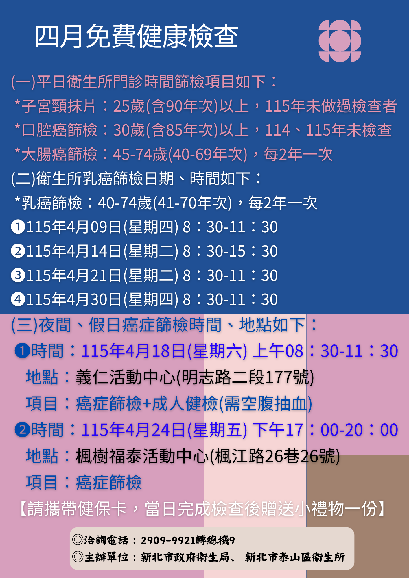 115年4月份免費成人健檢+癌症篩檢